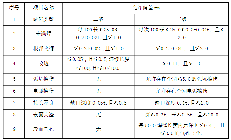 5、鋼結構焊接:焊條、焊絲、焊劑等焊接材料與母材的匹配應符合設計要求及現行行業.標準.《建筑鋼結構焊接技術規程》JGJ81 的規定,焊條、焊絲、焊劑在使用前按其說明書及焊接工藝的規定進行烘焙和存放。焊工須持證上崗,在其認可范圍內施焊,焊接時采用合理的焊接工藝,以減少由焊接產生的變形和應力,確保焊縫和構件的質量。本工程零部件連接處均需滿焊,焊縫厚度按設計要求,焊接時,盡量減少接縫數量,拼接應按等強度連接原則,選擇合適的焊接工藝和剖口形式,并設置在預應力較小部位,焊縫表面不得有裂紋、焊瘤等缺陷,表面無氣孔、夾渣、弧坑、電弧擦傷等缺陷,焊縫不得有咬邊,未焊滿根部收縮等缺陷,力求做到外形均勻,成型較好,焊縫與焊縫,焊縫與基層過渡平滑,焊渣和飛濺物須清理干凈,二、三級焊縫處外觀質量標準見下表: